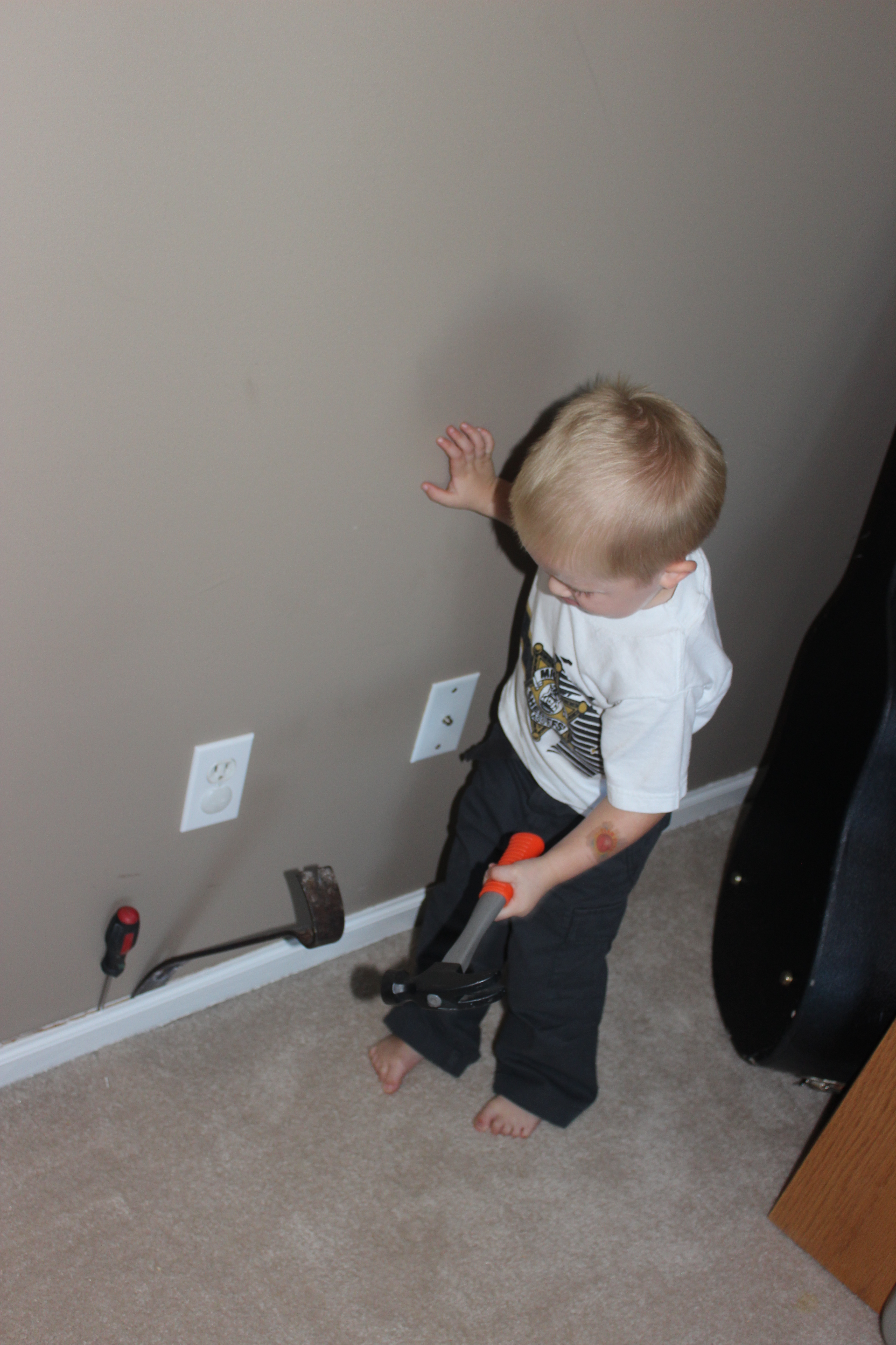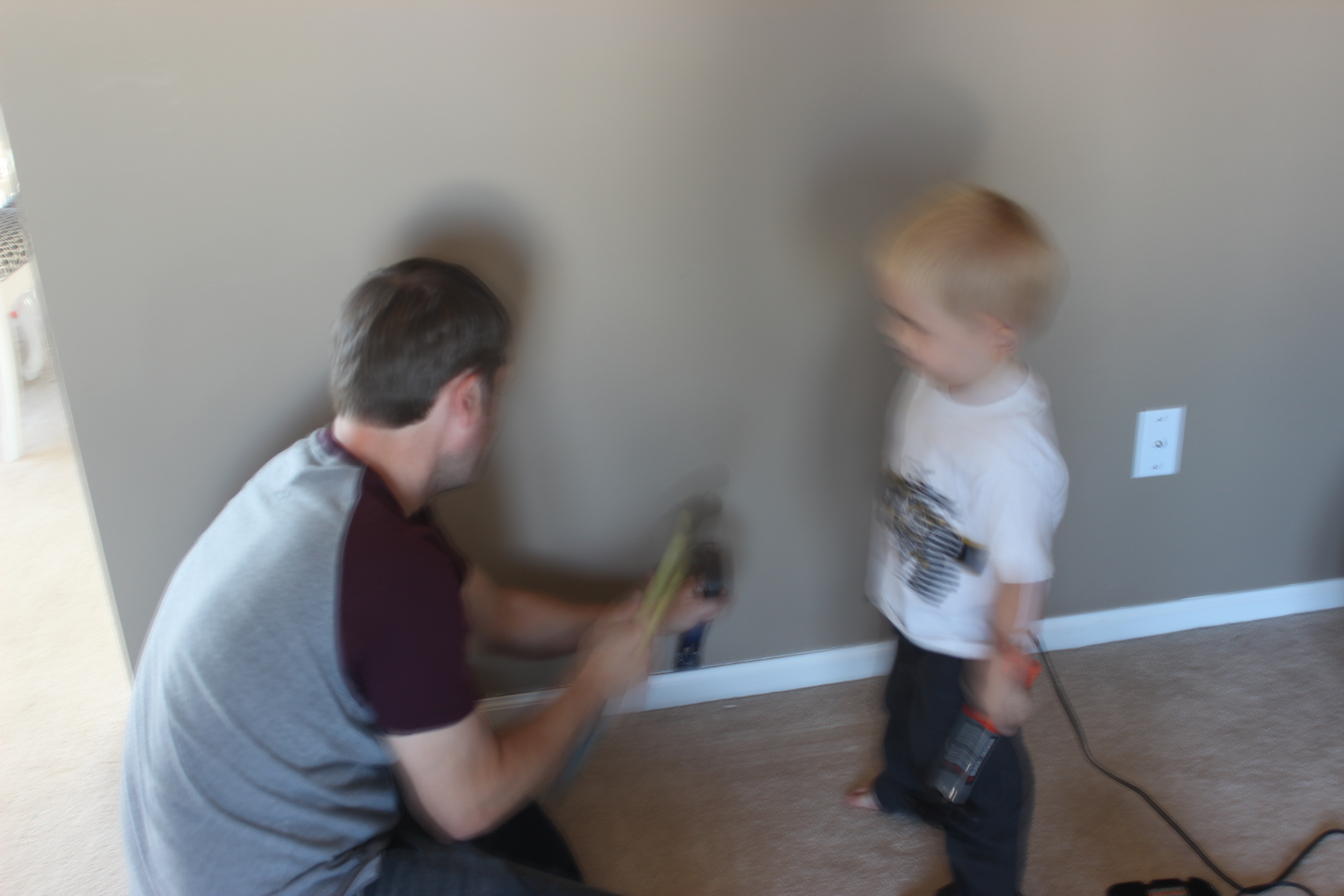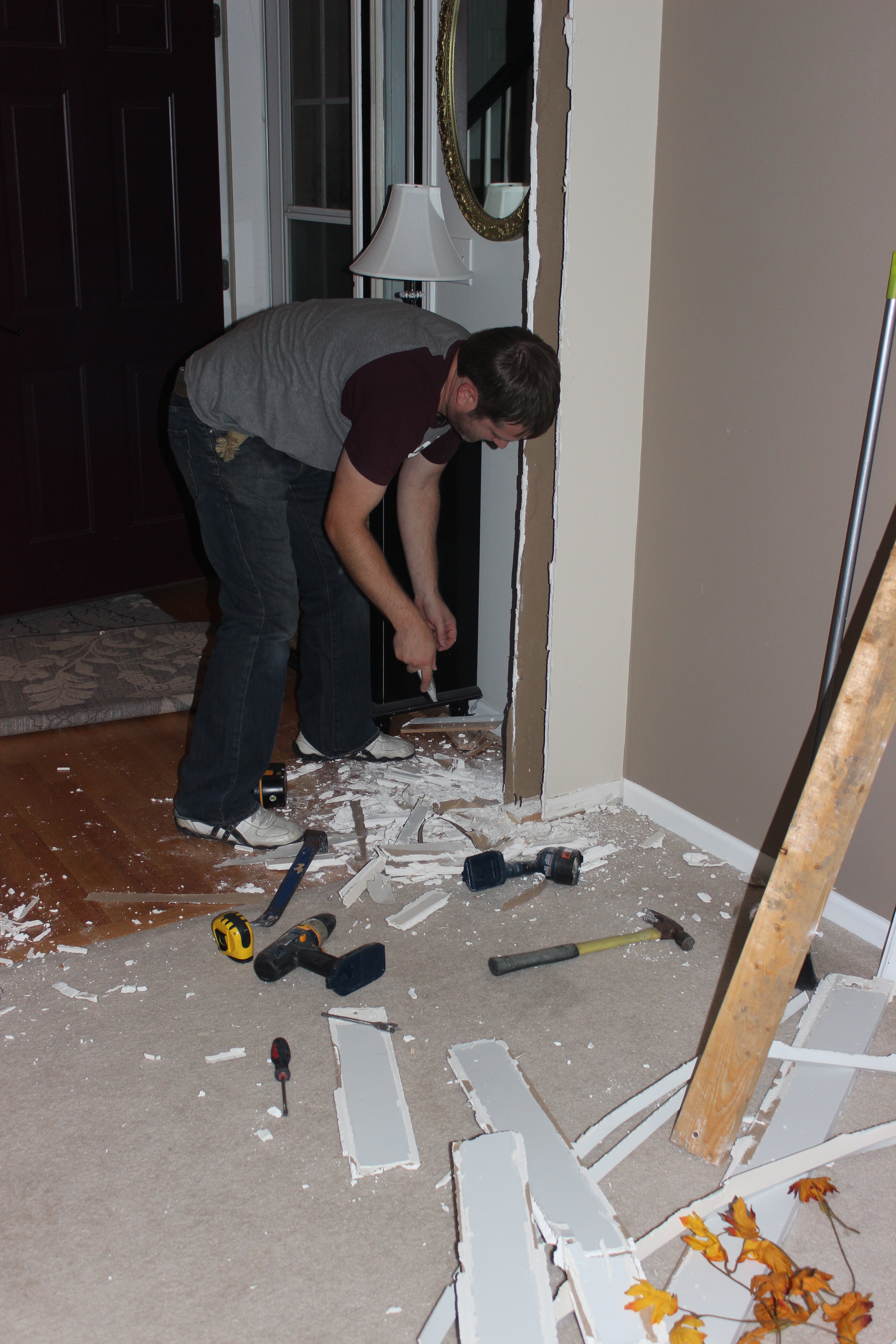 This past fall we decided to finally make our formal living room my hubby’s office and a library/music area. This room is large and we have some great plans for it but first we needed some french doors so my man could work without hearing all the household noises. Lowes was our go to place for the french doors. We purchased two sets, unfinished and framed. If you follow me on Instagram (bloomingange) then you caught some pics of the action and even the finished product. The hubby did all the hard work of installing the doors, cutting out some drywall, fitting them in, installing the trim around the doors. I forgot to mention he did have some help.