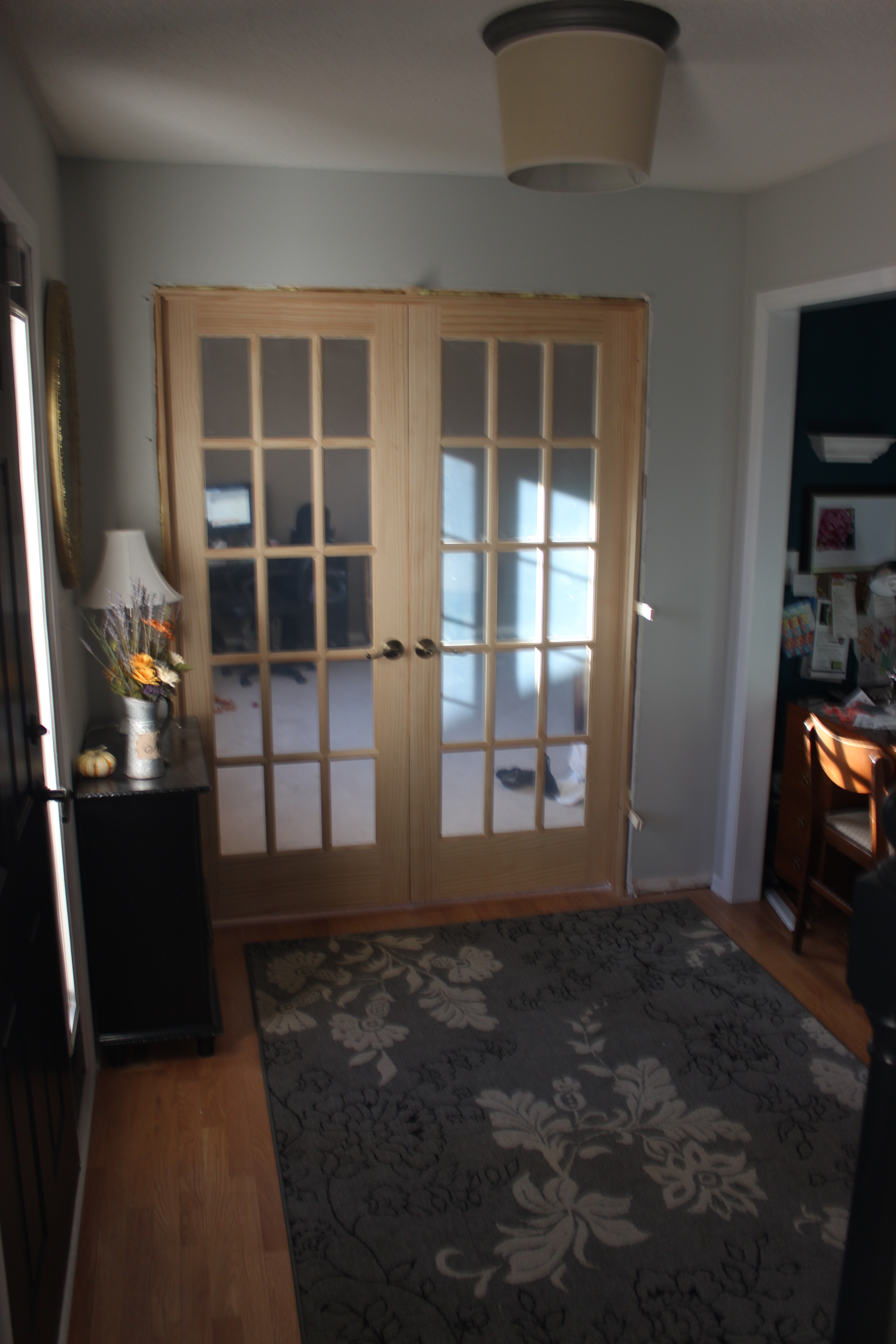 As you can see, for a while we were using the oak door slabs from when we replaced our interior doors. This didn’t work very well, the french doors are much much better. The next few shots are from inside the office looking towards the dining room and the entryway.