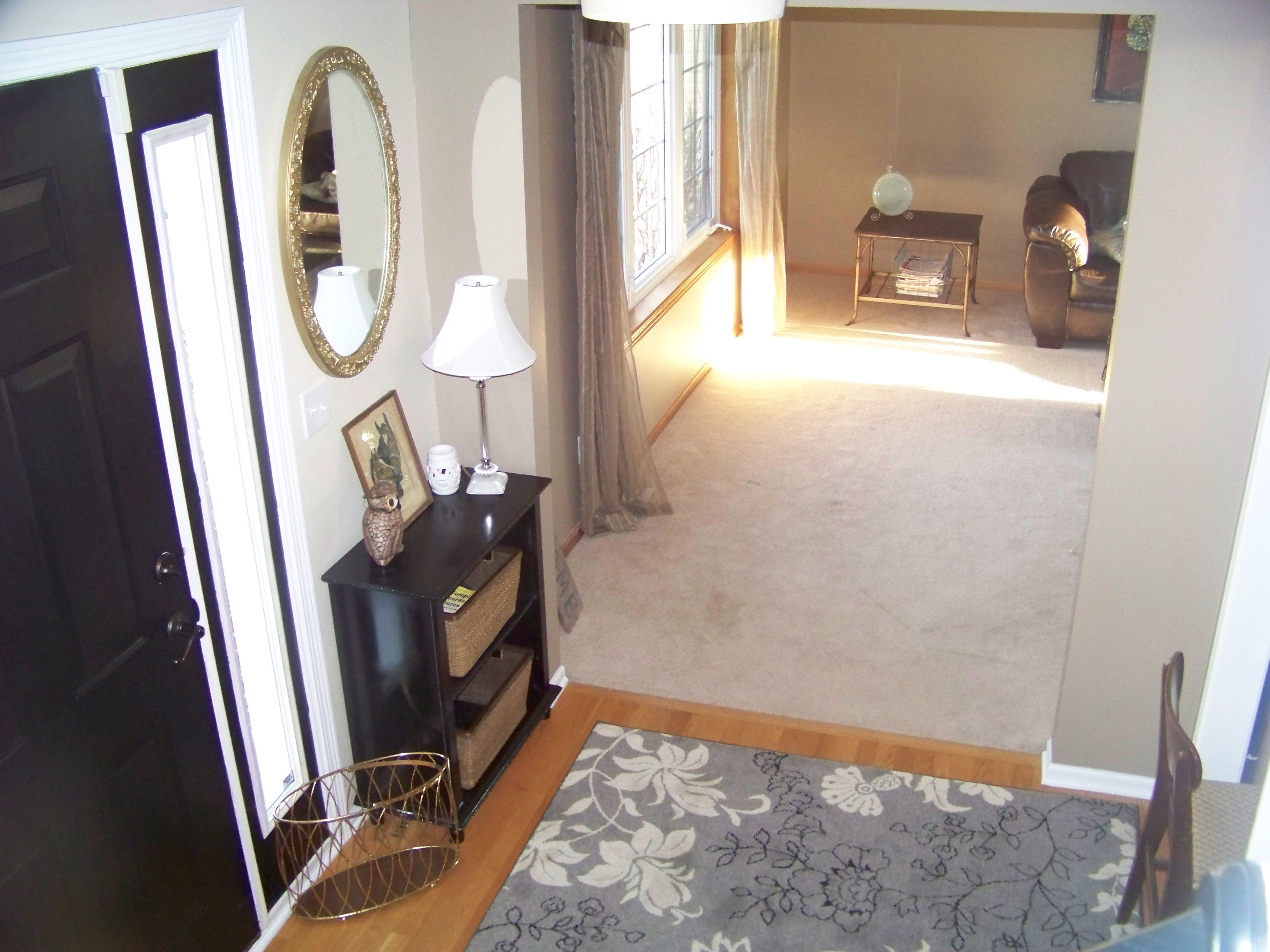 Just a reminder, here is how the entryway looked last fall after I did the cloffice and entryway along with painting the trim white. The formal living room was never being used (unless you count the kids using the couches for gymnastics) so I finally convinced the hubby to try it out as his office. He brought up his little desk from the dungeon and did a test run.