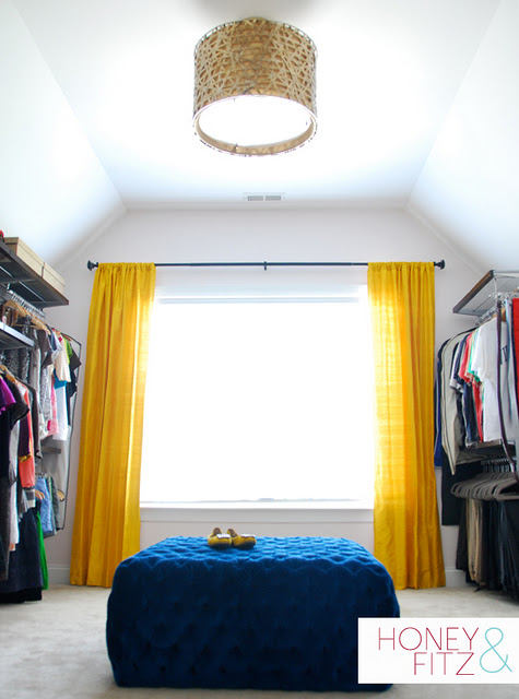 I installed an Elfa shelving and drawer system from The Container Store and created his and hers sides. I created a small vanity area on my side by mounting a shelf at counter height and putting a vintage mirror above it. It’s the perfect spot for jewelry, perfume, and a framed picture of my favorite people. I made super bright, sunshine yellow silk drapes and had a local upholsterer create a glam, navy blue velvet tufted ottoman that I designed to go right in the middle of the room. Now instead of a room we never used, we have a great space that we use every day.