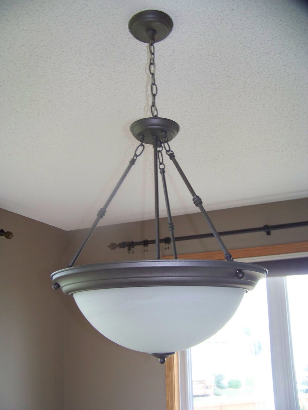What a darling little boy! That certainly was the mother of all boob lights – it must have been nursing. You might want to let your new light hang down quite a bit more from the ceiling so that it relates better to the furniture beneath it.