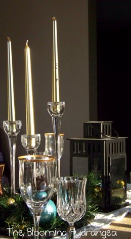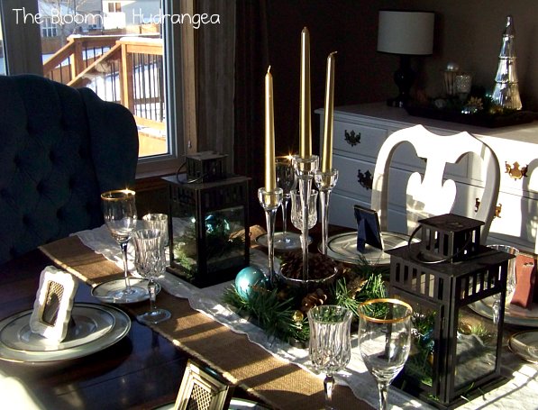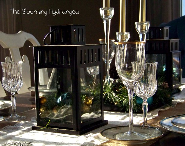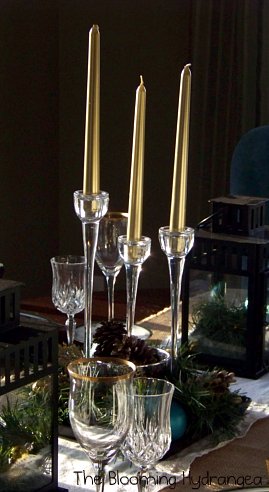 The lanterns and the candle sticks are from IKEA.  I used some tree garland,  pine cones and colored bulbs that I had from last year around the IKEA candle sticks.