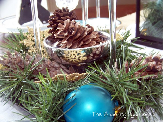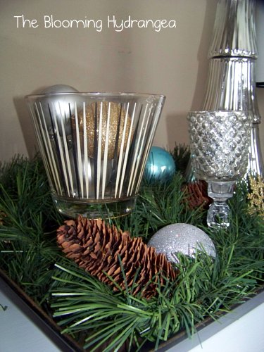 Finally, I found this mercury glass tree at Marshalls but sadly they only had one left. I added this cool vintage glass bowl on a gold candlestick I found at Savers and a mercury glass votive from Target all wrapped in garland with some more pinecones and bulbs.  Are you sensing a theme here?