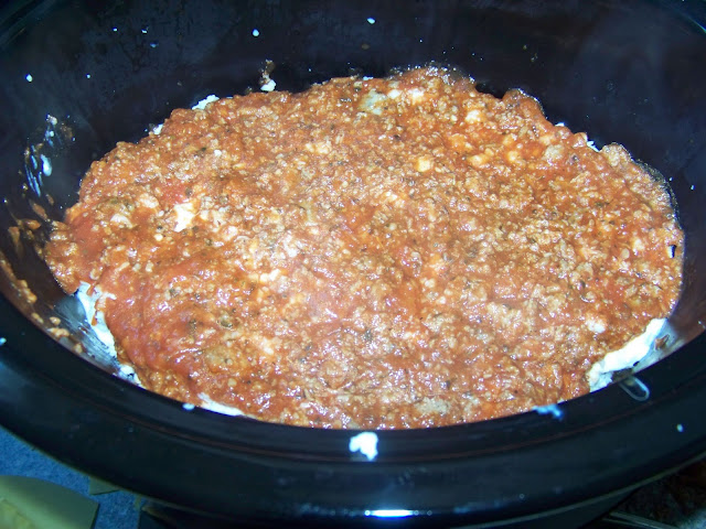 I was hoping to have a new meal to share earlier in the week but this week has just been flying by! Maybe the birth of my niece on Monday threw things out the door, not really sure but what a great reason to have your week go haywire! Anyways, this wasn’t on my menu plan but I have all the ingredients for it and I thought I’d give it a whirl. So today I’m making crock pot lasagna! I even remembered to take some pictures, woo hoo! I got the recipe from Stephanie at A Year of Slow Cooking. and if you haven’t been over there to check out her blog yet, what are you waiting for!?!