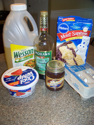 You will need one box of yellow or white cake mix, oil, eggs, Creme De Menthe liqueur or syrup, one 8 oz. jar of hot fudge sauce and a 12oz. container of whipped topping.