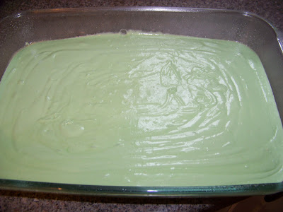 Prepare the box mix as per the directions on the box except you will replace 1/2 of the water in the cake mix recipe with the Creme De Menthe.