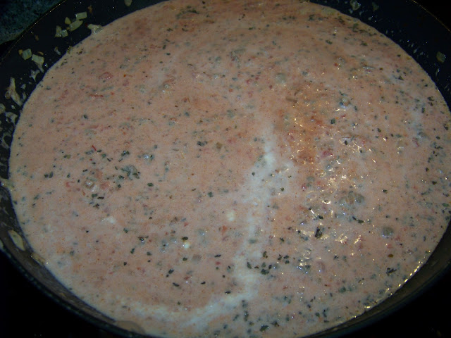Stir in the tomatoes, heavy whipping cream, salt and basil. Bring to a boil over med. heat. Reduce heat, simmer, uncovered for 6-8 mins. or until thickened, stirring occasionally.  In the meantime, cook your pasta.  I like to cook mine al dente.