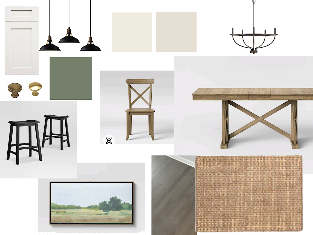 After throwing around a few ideas, I put together a mood board and if the table matches my chairs, I think we have a winner. I’ve gone back and forth on painting the island. I may even just pick a slightly different shade of green. But I have loved all the touches of green in here.