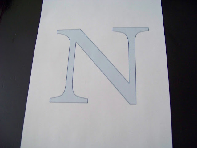 Monogrammed stuff is everywhere these days, so I decided to jump on the Monogramming band wagon and get branded! I am making a gallery wall for over the sofa and I wanted to add something different. I was thinking a Monogrammed letter would be cool. Ok, first I have a confession, I originally had a cool letter N from Hobby Lobby that I was going to paint black and put on the wall but in a horrible moment of anger I threw it on the ground and it broke. Sigh. I know. Bad me. I’m working on that and also just trying to keep it real around here. So after I broke the letter I figured I better find a cheap and easy way to make the N. I opened up Google Docs because we don’t have Microsoft word and Google Docs is free. I did it as a drawing instead of a document and I found the font I wanted and made a big letter N to print out. It didn’t print out all nice and colored in, darn.