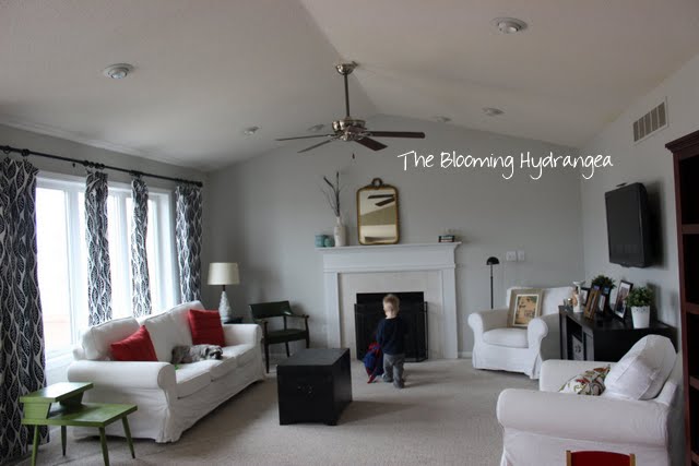 After painting the family room, kitchen and entry way BM Gray Owl this week, I thought maybe it was time to allow Ektorp back in to the family room. She had been banished to the basement for a while but I was missing her whiteness in my life. It also helps that I found an extra slipcover for the couch for $25 at IKEA a few months ago. Let’s just say, blue sharpie marker and a dog in heat have done some damage to the slipcovers. Who wants to sit on my couch?