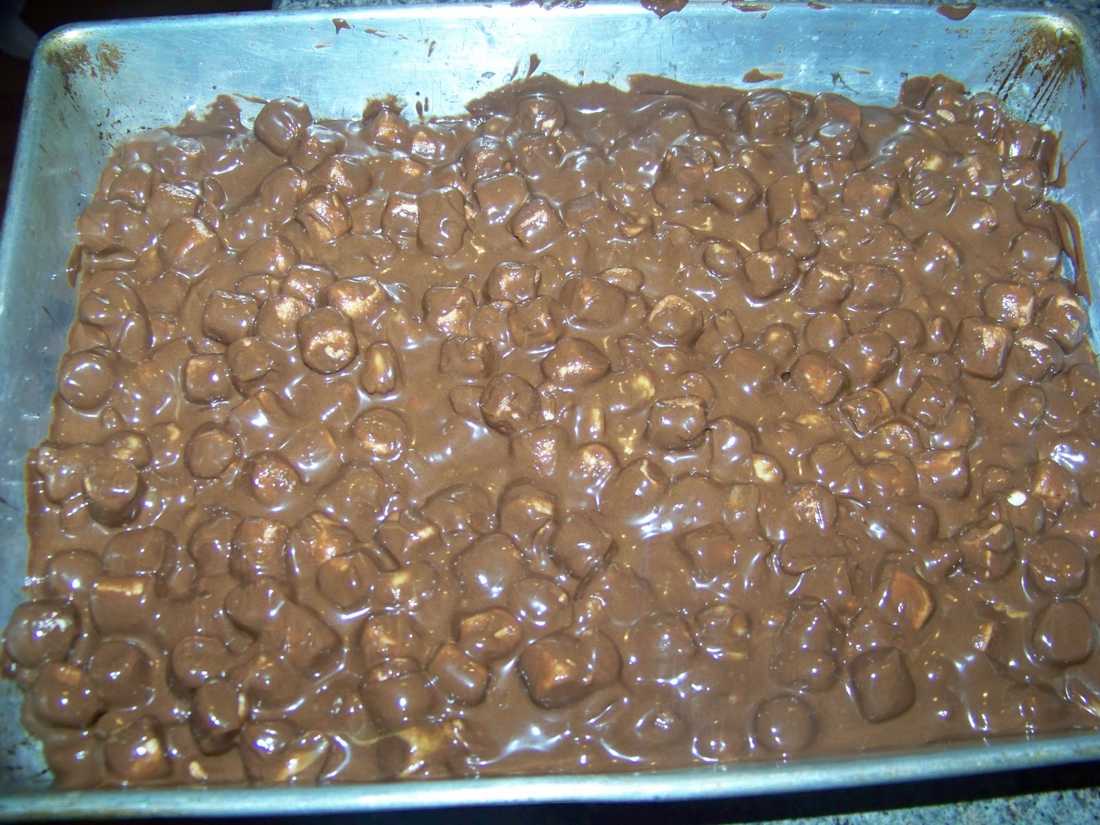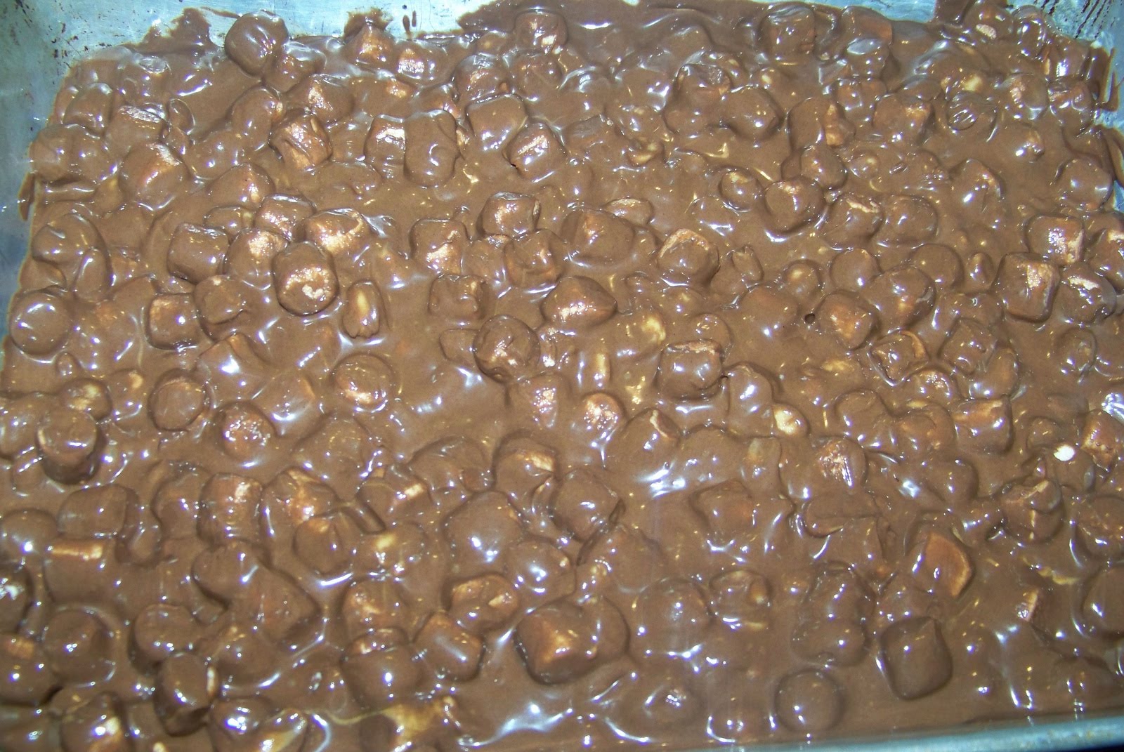 | After adding in the marshmallows and peanuts this is what it will look like in the pan. |