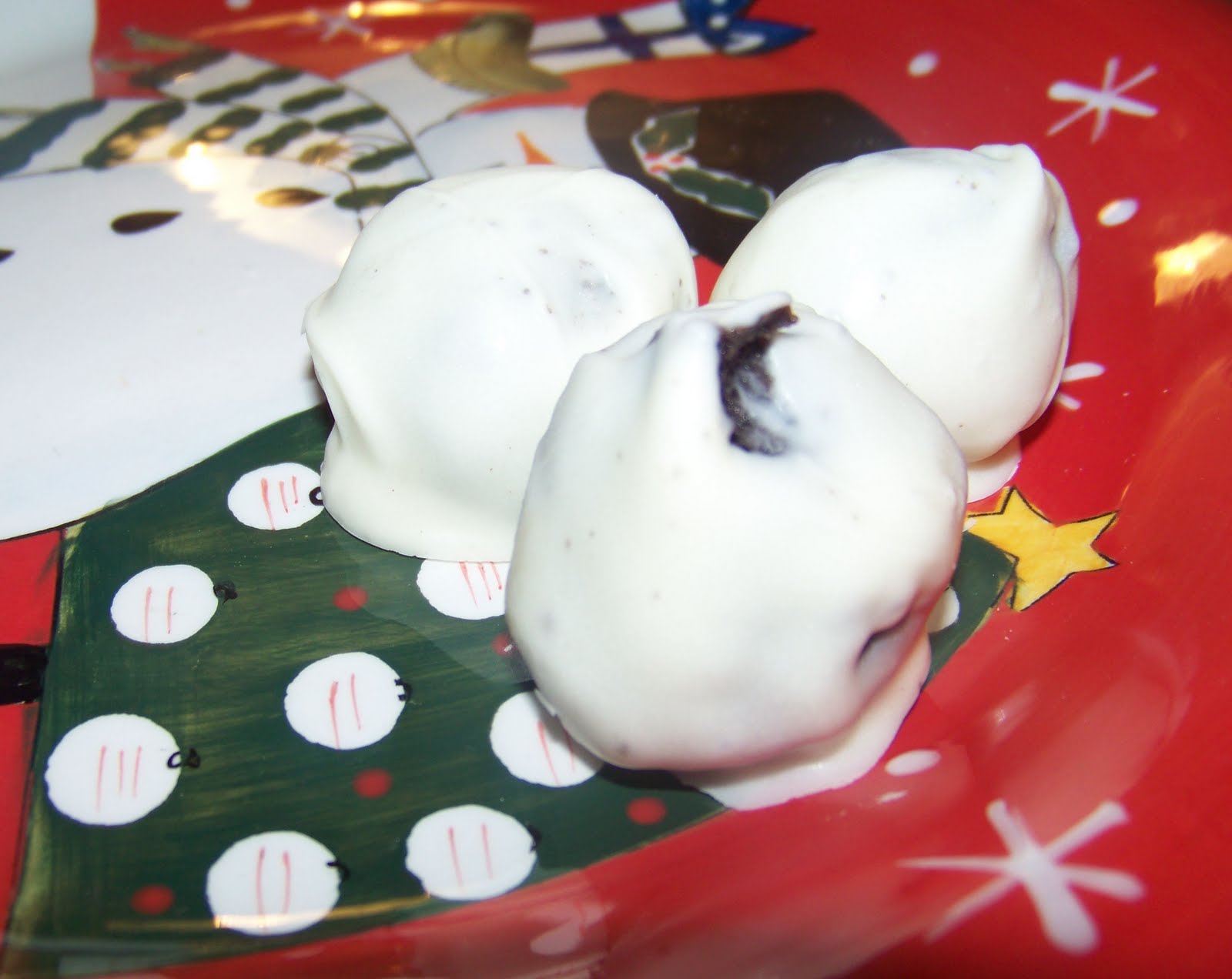 I placed the Oreo cookies in a large freezer bag and then went to town with my rolling pin, crushing and rolling those Oreos into a fine crumbly mess. I then dumped the crushed up cookies into a mixing bowl, added the softened cream cheese and mixed it all together until it looked like a big bowl of mud. Yummy, right? I then rolled the mixture into about one inch balls. I placed them on a cookie sheet and refrigerated the balls for about an hour or so, pretty much until they weren’t sticky to touch. It was suggested that I place a toothpick in each one before they hardened to make it easier to dip them in the white chocolate but I just didn’t have a lot of luck with that method. Here’s how mine looked before they went dipping! Not my prettiest or most perfectly rolled balls but they get covered in chocolate, so who’s gonna see them? If you will be eating these at my house this weekend, just ignore this picture. Ahem….so anyways, back to the recipe.