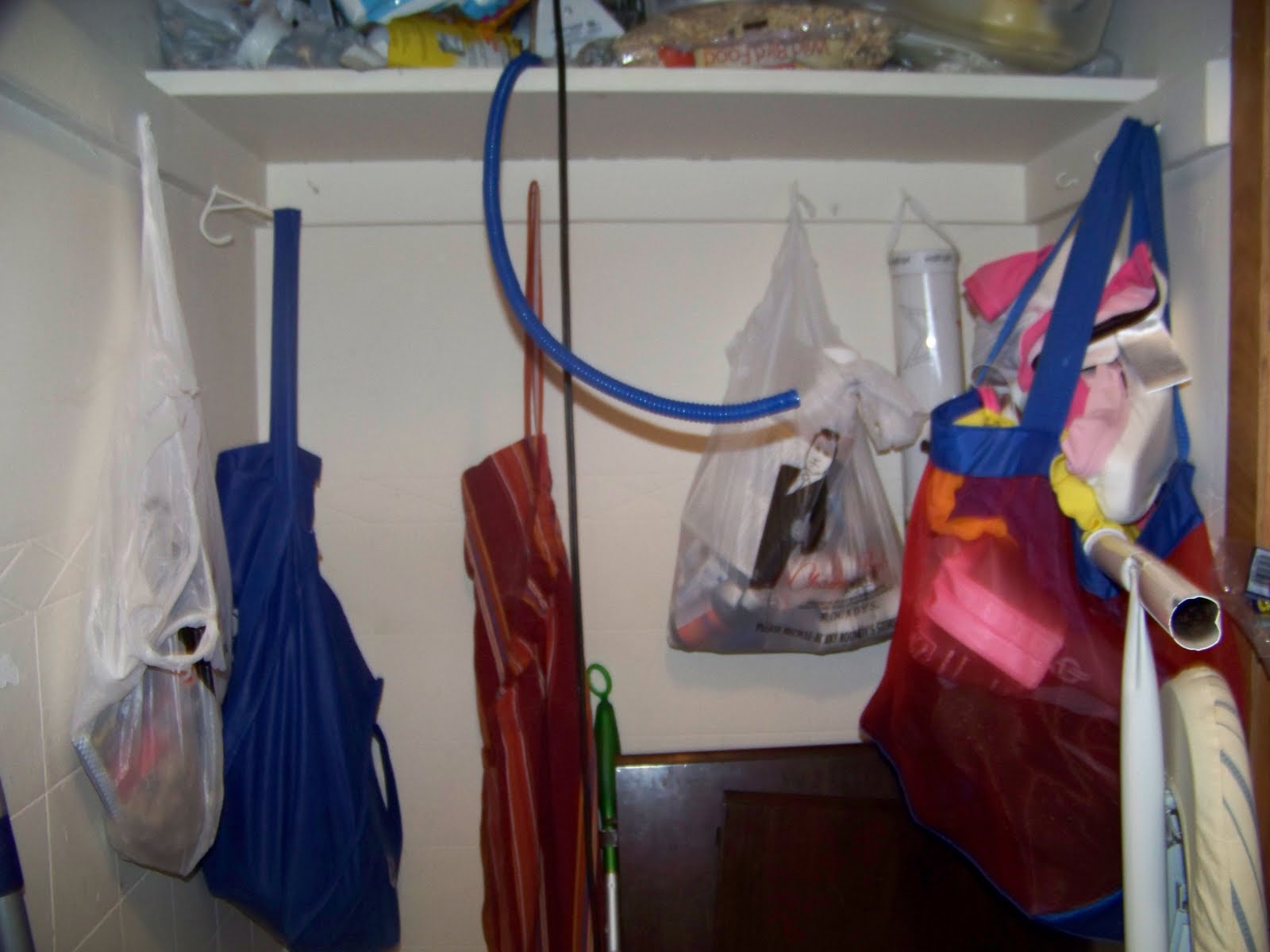We have one closet that is located right by the Cloffice and it looked like this earlier today, it is pretty much the vacuum, pet stuff, receipt, swimming, dining room table parts, paper products and guitar holding area. (I think my dear husband left his guitar in the truck from Sunday so it’s MIA in this photo but just picture a big black plastic type guitar case shoved in here.)