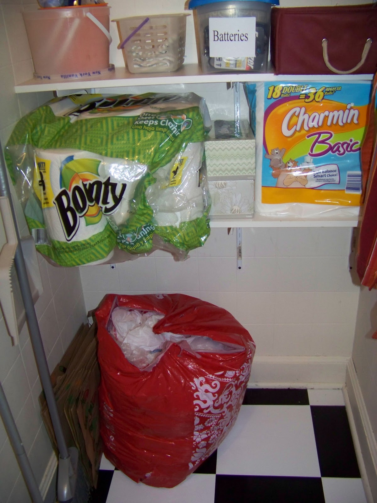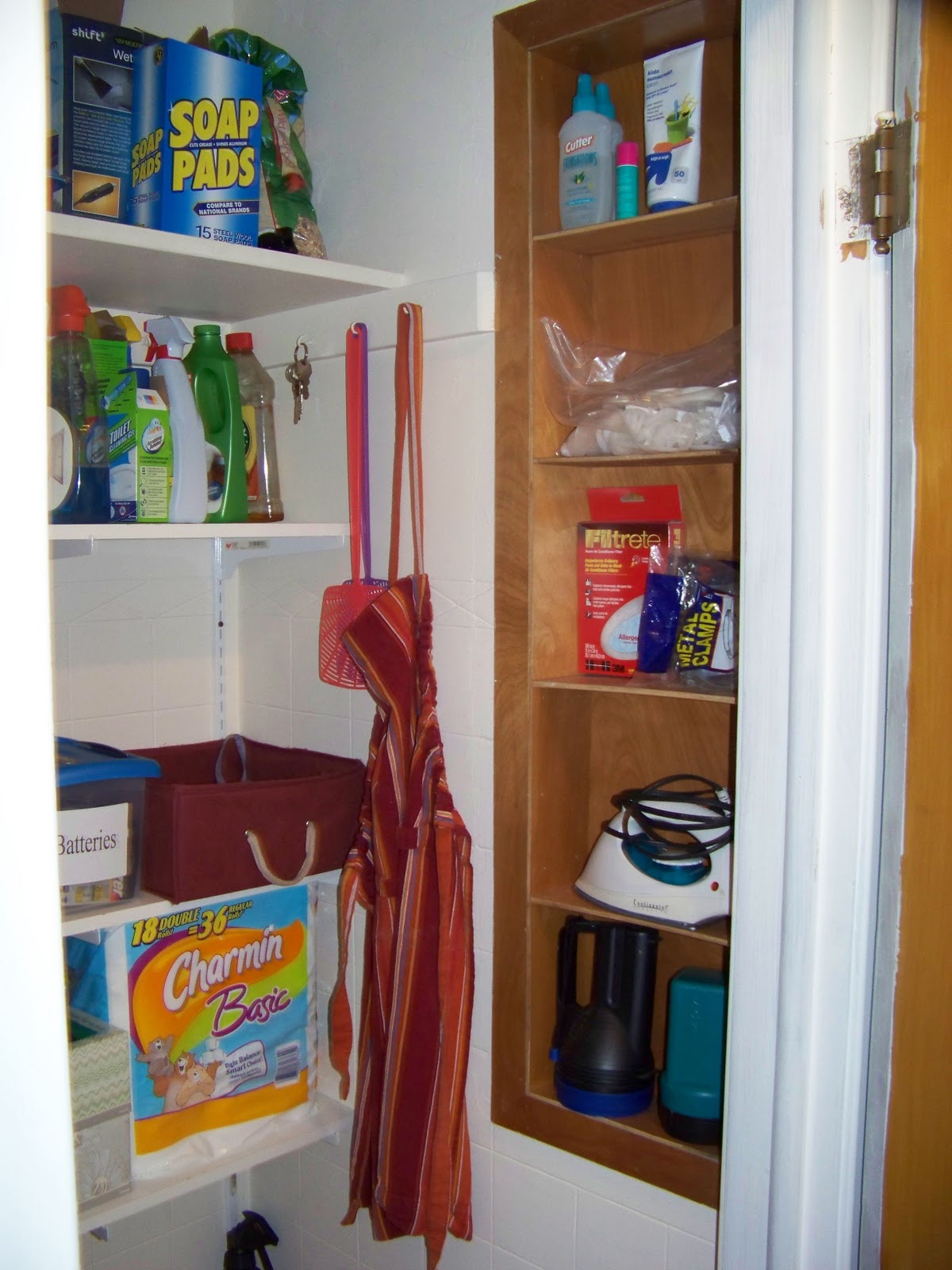 It doesn’t shut all the way and it’s very shallow so I decided to move all the cleaning stuff out of this one and onto the new shelving, along with the paper products, batteries, light bulbs and pet supplies. That darn Bounty papertowel would not cooperate for the pictures. I will have to beat it into submission later.
