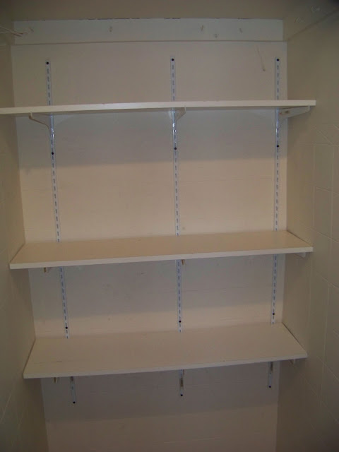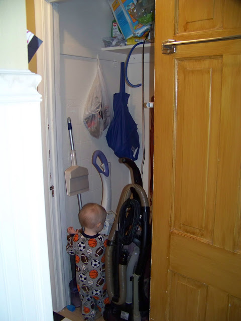 I then asked Mr.A if he would put the shelves we ripped out of the closet we turned into the cloffice in this closet for my cleaning supplies. Of course he couldn’t say no to little ol’ me.