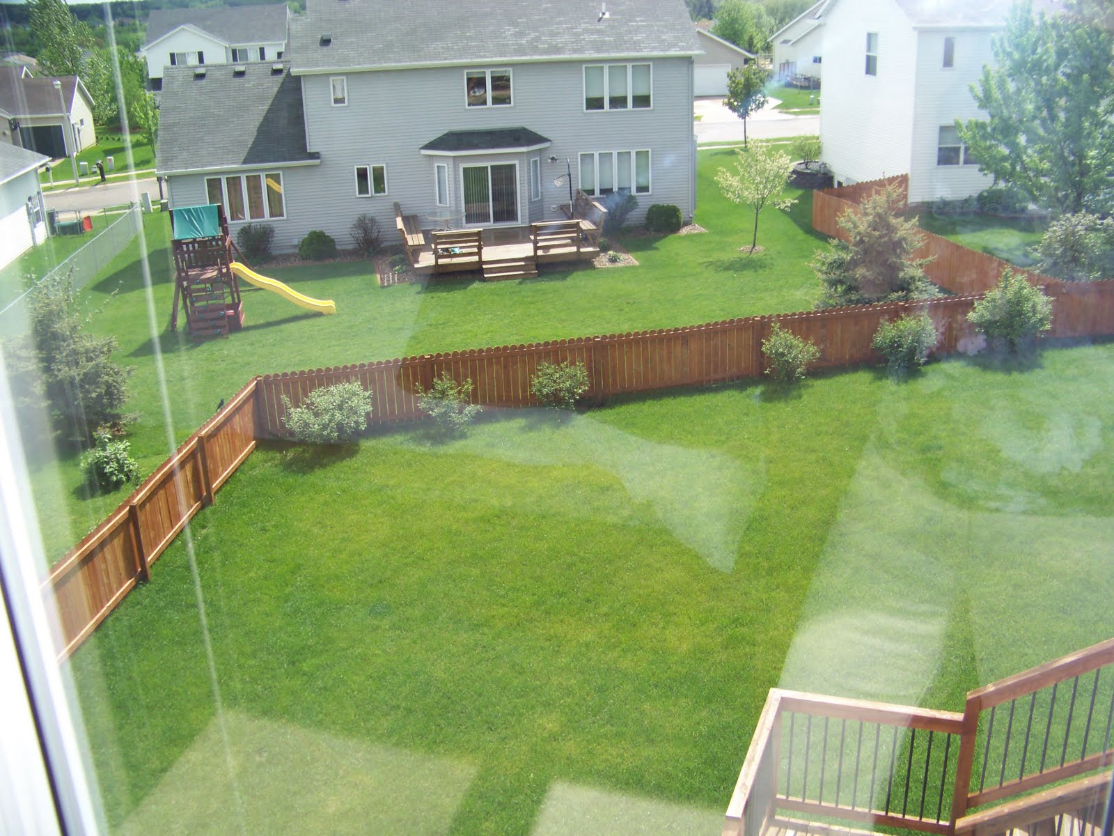 Sunday morning hubby was awake earlier than usual and had a little bit of a freak out about the house. He couldn’t remember a lot of the details because it was number six on the tour of eleven houses. He was thinking we maybe had made a big mistake. We called our realtor and scheduled another showing on our house. After walking through again we both felt a lot better about our house. Here are a few pictures of the outside from yesterday with green grass. The backyard photos were taken from the master bedroom inside so there is a slight glare.