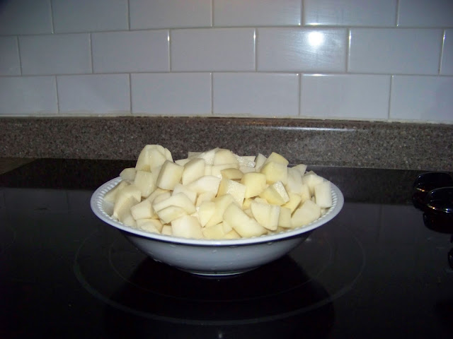 Peel and cube 8 to 10 medium size russet potatoes and then dice one medium yellow onion.