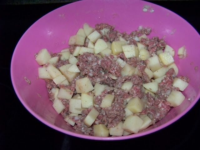 Crumble one pound raw ground beef into bowl with potatoes and onions, then generously salt and pepper the mixture. I usually let this sit in a bowl and meld together in the refrigerator for a few hours.