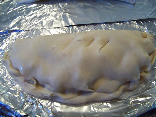Fold over the pie crust and pinch up the edges to seal the pasty shut. I cut a few slits in the top with a knife as well. Repeat the above steps until you are out of pasty filling or pie crusts.