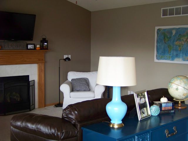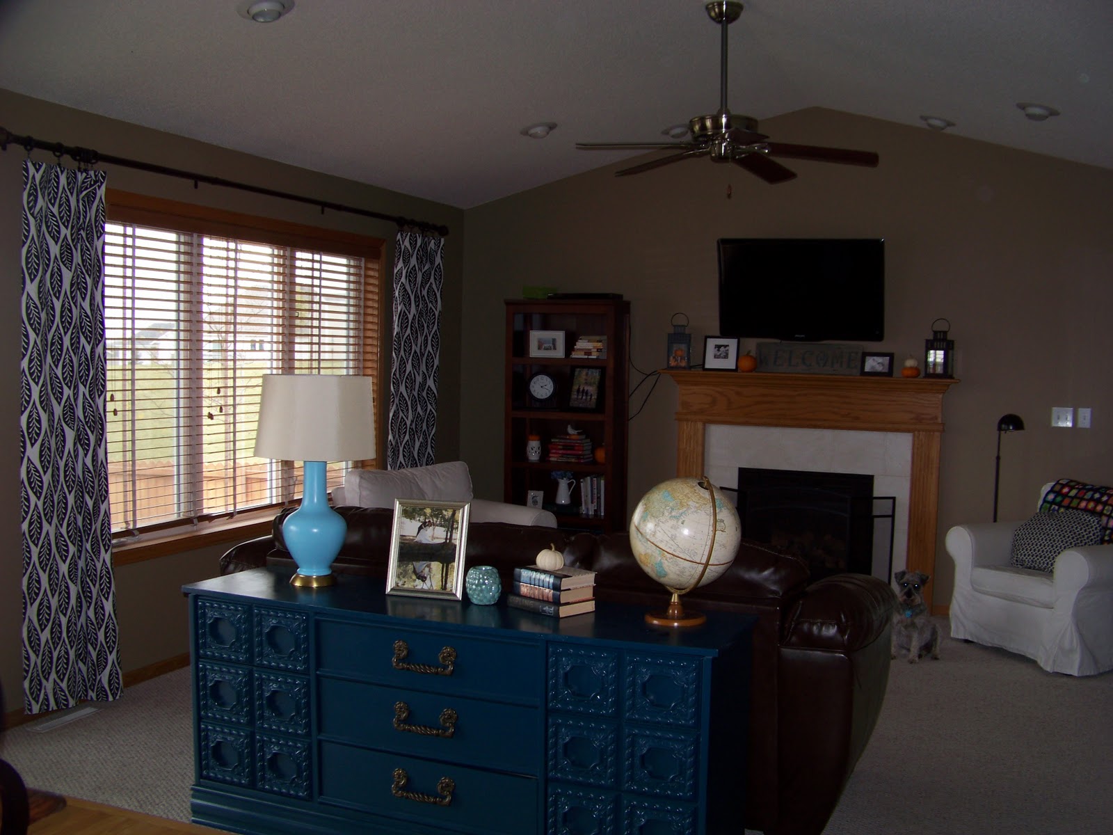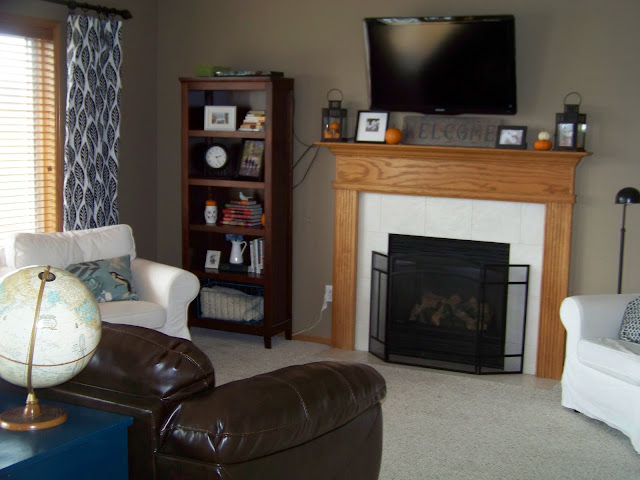 Finally, the hubs and I rearranged our family room on Thursday night. I got a wild hair about it around 11pm and we finished at 12:30 after moving the couch, chairs and love seat around to about 55 different configurations. So this room is still in the works but I’m loving this arrangement. We brought in the leather couch from the formal living room, put the Ektorp in the playroom/basement, moved the tv back over the fireplace, put the console behind the leather couch, added the bookshelf next to the fireplace for the Blu-Ray player and hung the giant map where the tv was mounted on the wall. I changed out the curtains and even decorated my mantle to try and hide the tv cords. lol! I would like to find a pair of lamps for the console, more maps for my map gallery wall, add some more pillows and paint the little blue table a different color. Some of the pictures are a little “grainy” as I have been experimenting with the settings on my camera. I’m hoping to become a master Photographer.