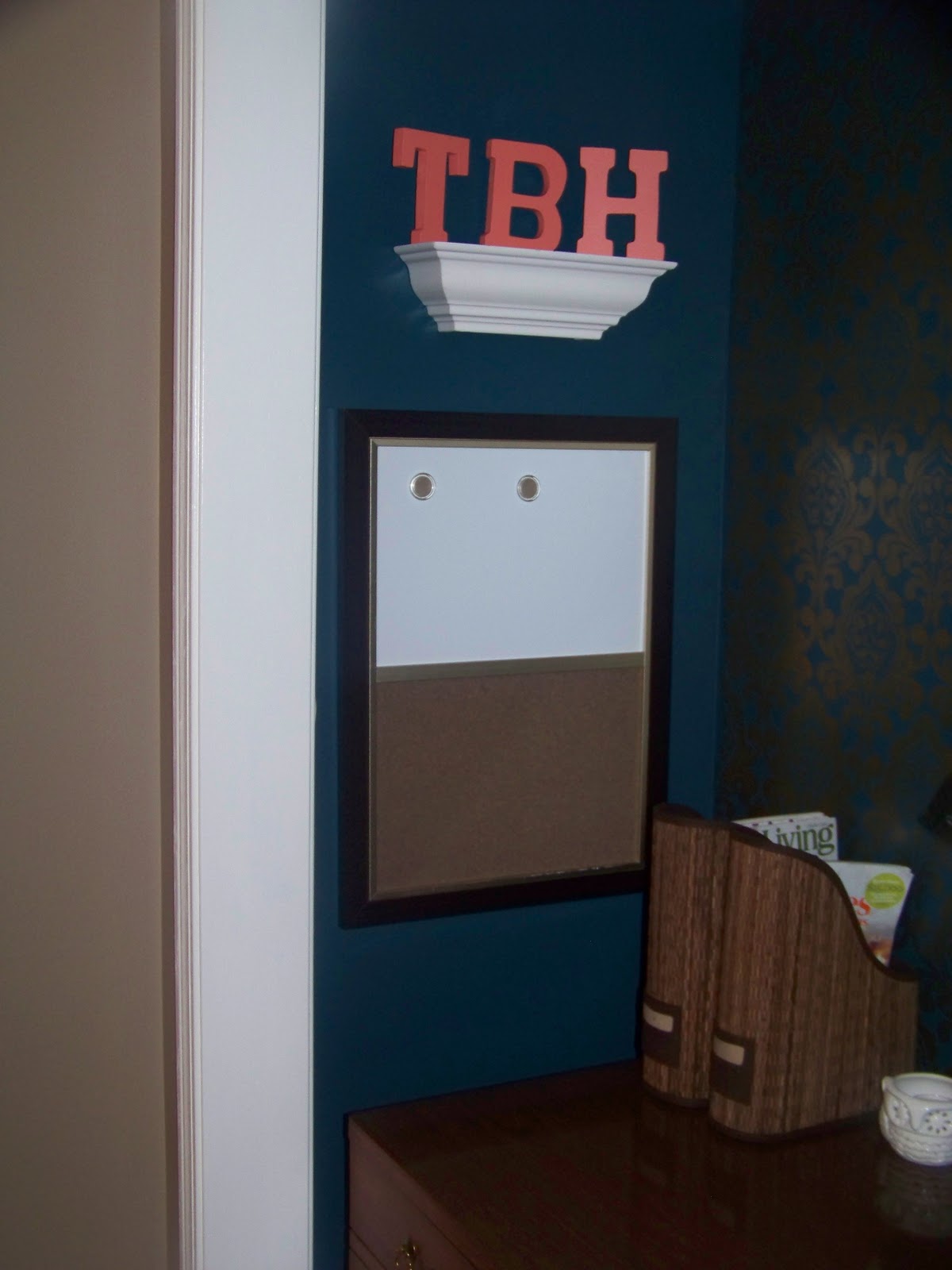The letters which represent my blog name are from Michaels and are painted Coral Reef from Sherwin Williams. The white board/cork board combo frame also came from Michaels. The magazine holders are from IKEA.