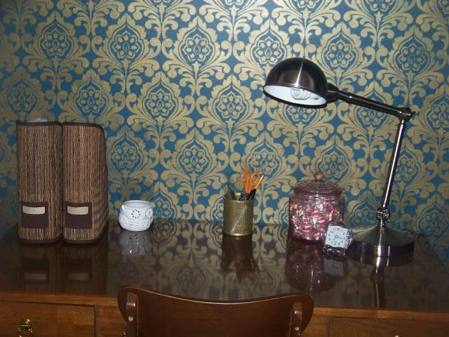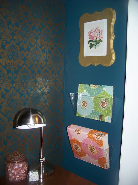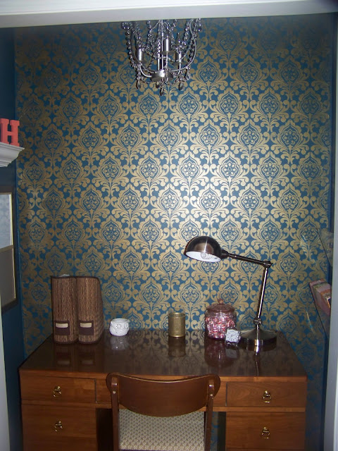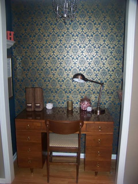 Wow! What a little jewel box of a nook you've created for yourself! That stencil looks fantastic. I would totally think it's wallpaper if you didn't tell me it was a stencil. Great use of space!