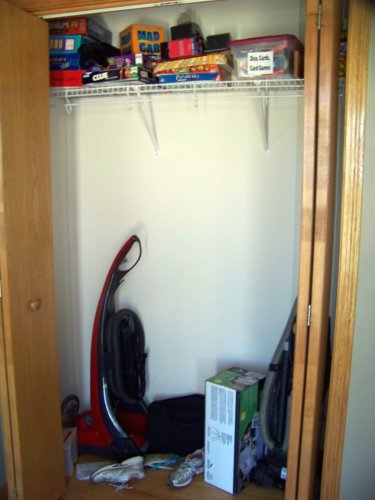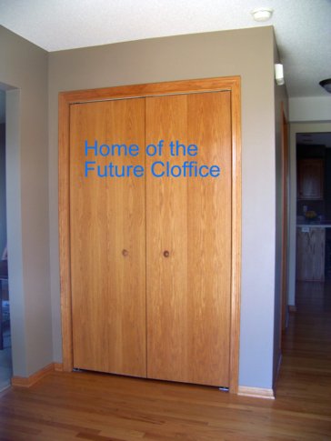 I knew right away that a cloffice was in our future and I had the perfect place for it, the front closet.  After a bit of convincing, the hubby agreed we could turn the closet into a cloffice.  Let the fun begin!  The only obstacle was finding somewhere for our games and vacuums, guests to hang their coats when visiting our home.  We completed the entryway a few weeks ago and you can check out that post to see what we ended up doing for the guest coat dilemma.
