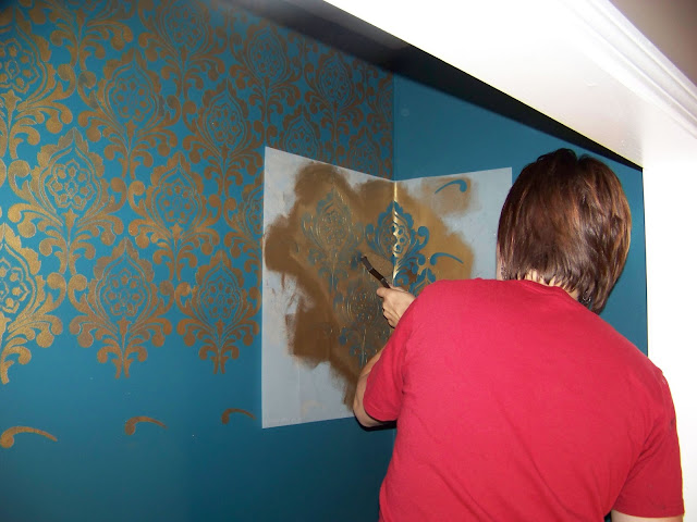 Wallovers also sent me the Topper Stencil which made doing the area near the ceiling very easy.  Here is the hubby figuring out how the Topper works.