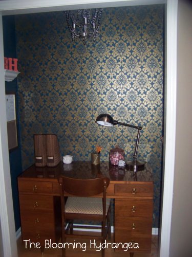 That is such a gorgeous cloffice. The wall stencil is amazing! The colors and the design. It looks soooo perfect-thanks for the great instructions. You've got me dreaming of stenciling …something…I just don't know what. The ceiling with the chandelier is such a surprising detail-so beautiful.