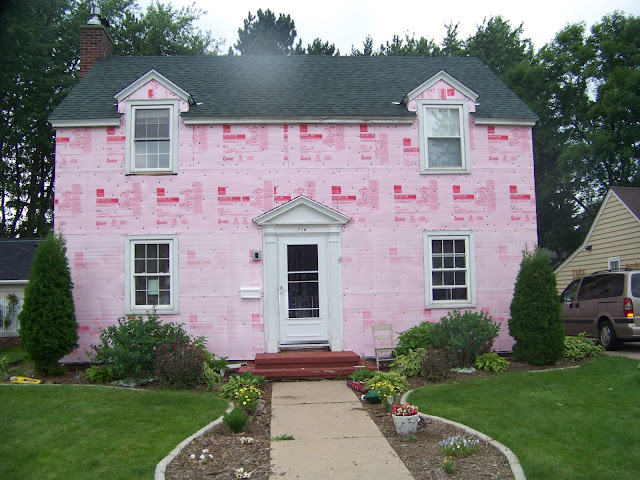 After ripping off the shakes the tar paper was the only thing protecting our house from the elements.  This was one of the rainiest summers on record where we live and I like to think it’s because we had an exterior project.  The wind ripped  some of the tar paper off and it made exterior of our house look like it had recently been on fire and the inside of our house felt like a fire because black and sunshine=hot!  We didn’t have central air because that went kaput during the kitchen remodel when Mr. A hooked it up, oops!  (He really is handy, that was just one oops.)   After a few weeks of people asking if our house had been on fire and taking the kids to the grocery store to cool off, the house wrap and  pink insulation panels went up.  Progress!!!!