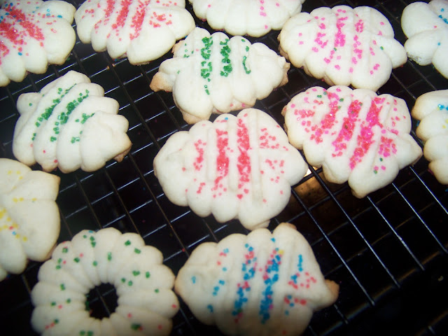 Gradually add 2 1/2 c. Flour and 1/2 tsp. Salt. Mix well and then put in your cookie press. Press onto ungreased cookie sheets, add sprinkles and bake at 400 degrees for 6-8 minutes. This is what they look like prior to baking, the spinkles make a nice mess on the sheet.