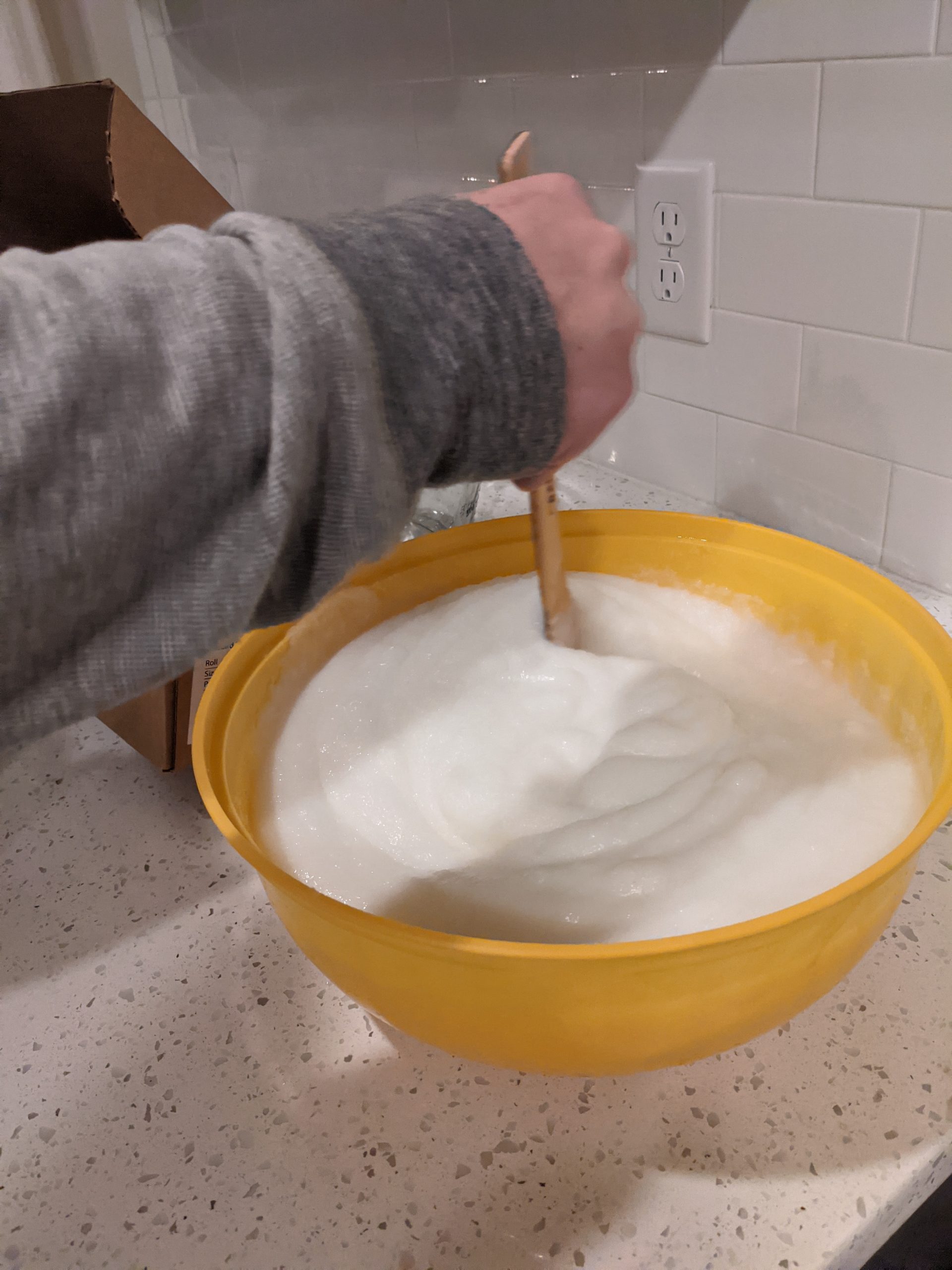 You simply pour the powder into a bowl and mix it up with a gallon of water. Make sure you remove the cat from the bowl and wash it out first. Seriously, she was so intrigued by this whole process. The paste was super simple to mix and was so easy to work with. Bonus, there really isn’t a strong odor with the paste and it easily washed off my hands.